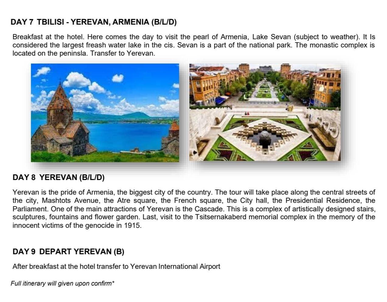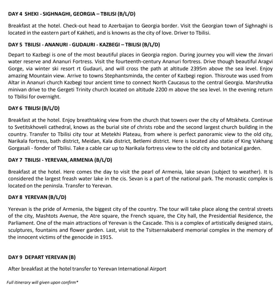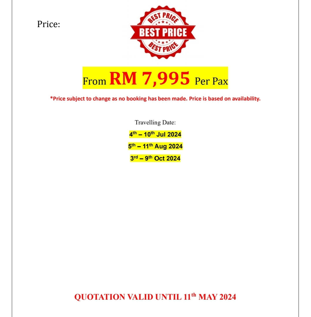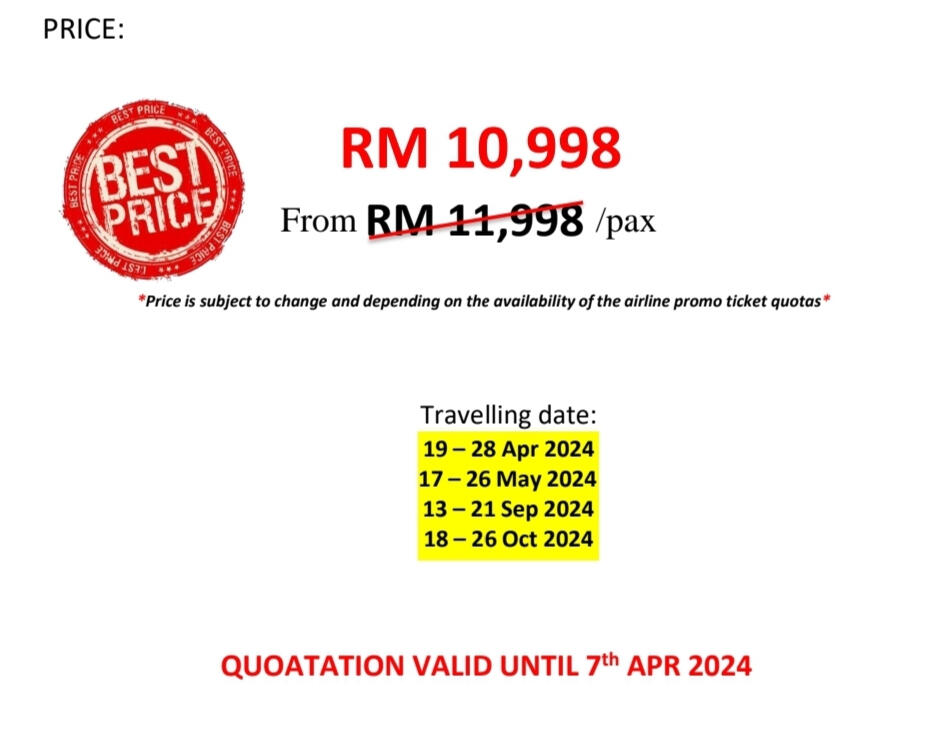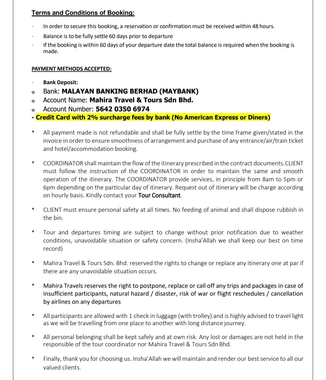 - In order to secure this booking, a reservation or confirmation must be received within 48hours.- Balance is to be fully settle 60 days prior to departure.- If the booking is within 60 days of your departure date the total balance is required when the booking is made-HOST shall maintain the flow of the itinerary prescribed in the contract documents. CLIENT must follow the instruction of the HOST in order to maintain the same and smooth operation of the itinerary.-The HOST provide services, in principle from 8amto 5pm. Request out of itinerary will be charge according on hourly basis.* The sequence of tour days might change or swap depending on any closure or disruption. Eg: if there is an overbooked cruise on the day 1 tour, therefore it will be swap with another day and replace the other day tour on that day.* CLIENT must ensure personal safety at all times. No feeding of animal and shall dispose rubbish in the bin.* Tour and departures timing are subject to change without prior notification due to weather conditions,unavoidable situation or safety concern. (we shall keep our best on time record)* Mahira Travel & Tours Sdn. Bhd. reserved the rights to change or replace any itinerary one at par if there are any unavoidable situation occurs.* Mahira Travels reserves the right to postpone, replace or call off any trips and packages in case of insufficient participants, natural hazard / disaster, risk of war or flight reschedules / cancellation by airlines on any departures* All personal belonging shall be kept safely and at own risk. Any lost or damages are not held in the responsible of the tour coordinator nor Mahira Travel & Tours Sdn Bhd.* All credit/debit card payment method will be charge 1.5% bank charges from the total amount* Finally thank you for choosing us, we shall render our best possible service to you InsyaAllah