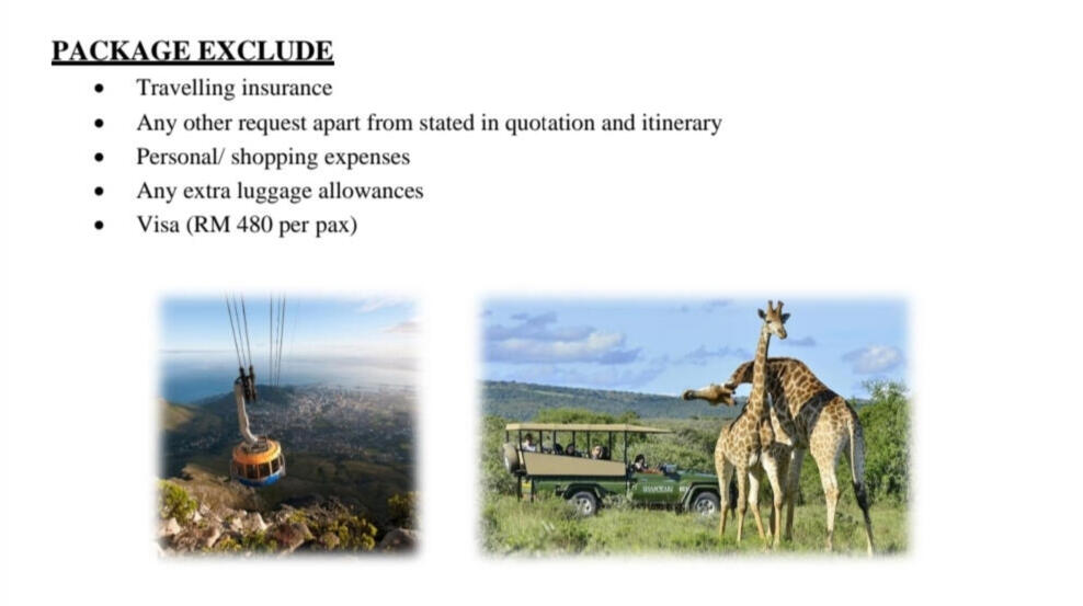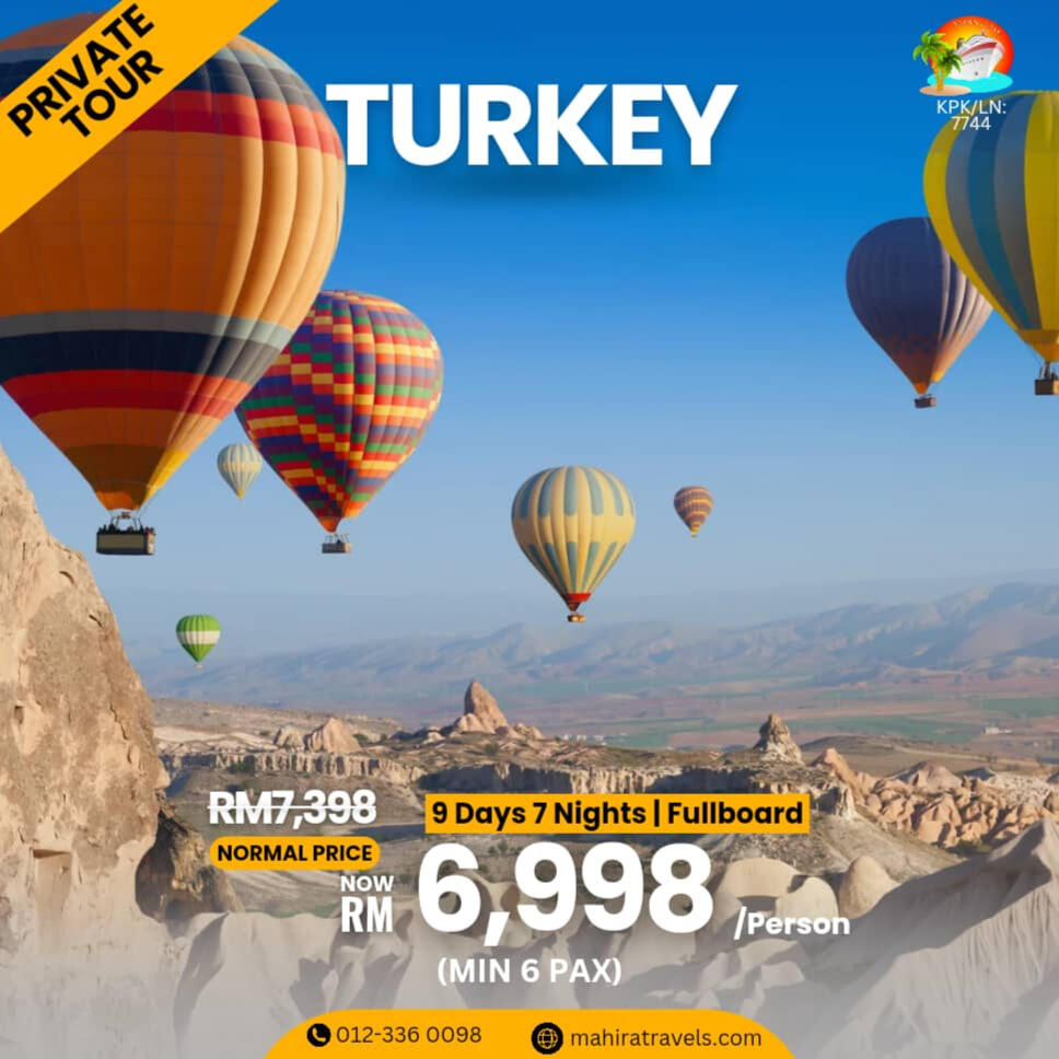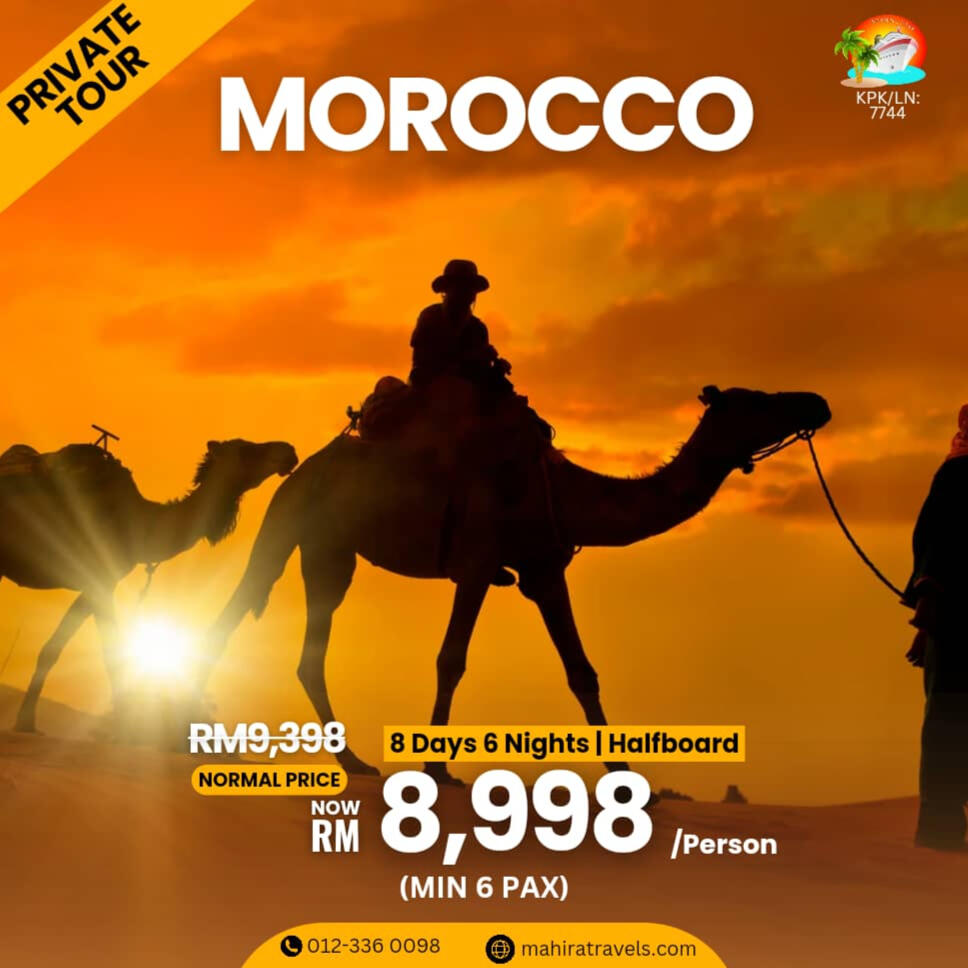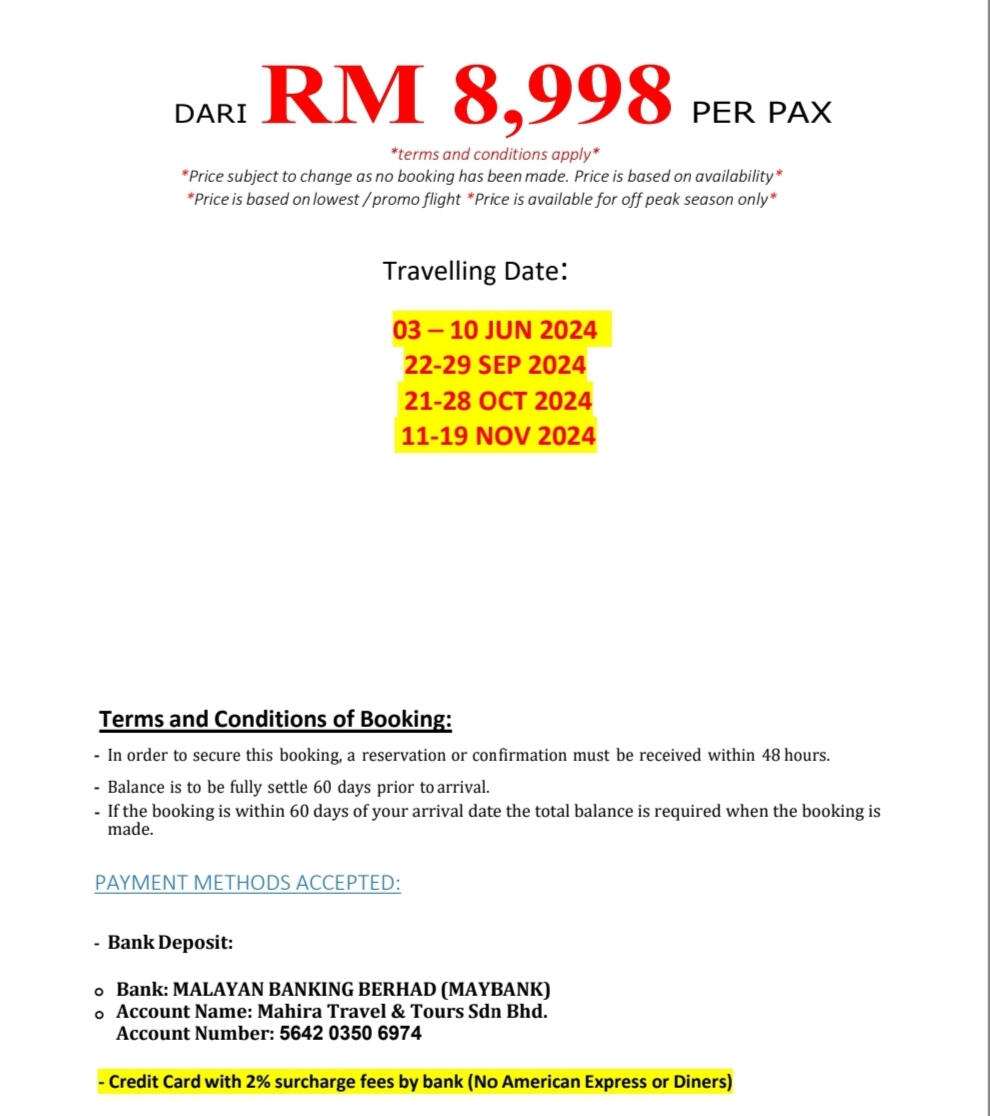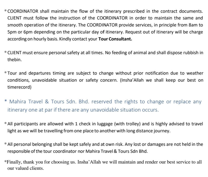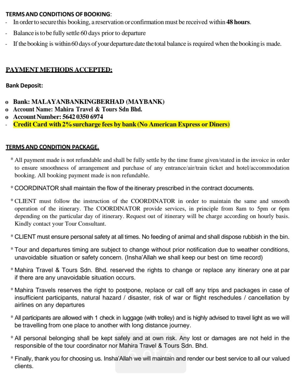 - In order to secure this booking, a reservation or confirmation must be received within 48hours.- Balance is to be fully settle 60 days prior to departure.- If the booking is within 60 days of your departure date the total balance is required when the booking is made-HOST shall maintain the flow of the itinerary prescribed in the contract documents. CLIENT must follow the instruction of the HOST in order to maintain the same and smooth operation of the itinerary.-The HOST provide services, in principle from 8amto 5pm. Request out of itinerary will be charge according on hourly basis.* The sequence of tour days might change or swap depending on any closure or disruption. Eg: if there is an overbooked cruise on the day 1 tour, therefore it will be swap with another day and replace the other day tour on that day.* CLIENT must ensure personal safety at all times. No feeding of animal and shall dispose rubbish in the bin.* Tour and departures timing are subject to change without prior notification due to weather conditions,unavoidable situation or safety concern. (we shall keep our best on time record)* Mahira Travel & Tours Sdn. Bhd. reserved the rights to change or replace any itinerary one at par if there are any unavoidable situation occurs.* Mahira Travels reserves the right to postpone, replace or call off any trips and packages in case of insufficient participants, natural hazard / disaster, risk of war or flight reschedules / cancellation by airlines on any departures* All personal belonging shall be kept safely and at own risk. Any lost or damages are not held in the responsible of the tour coordinator nor Mahira Travel & Tours Sdn Bhd.* All credit/debit card payment method will be charge 1.5% bank charges from the total amount* Finally thank you for choosing us, we shall render our best possible service to you InsyaAllah