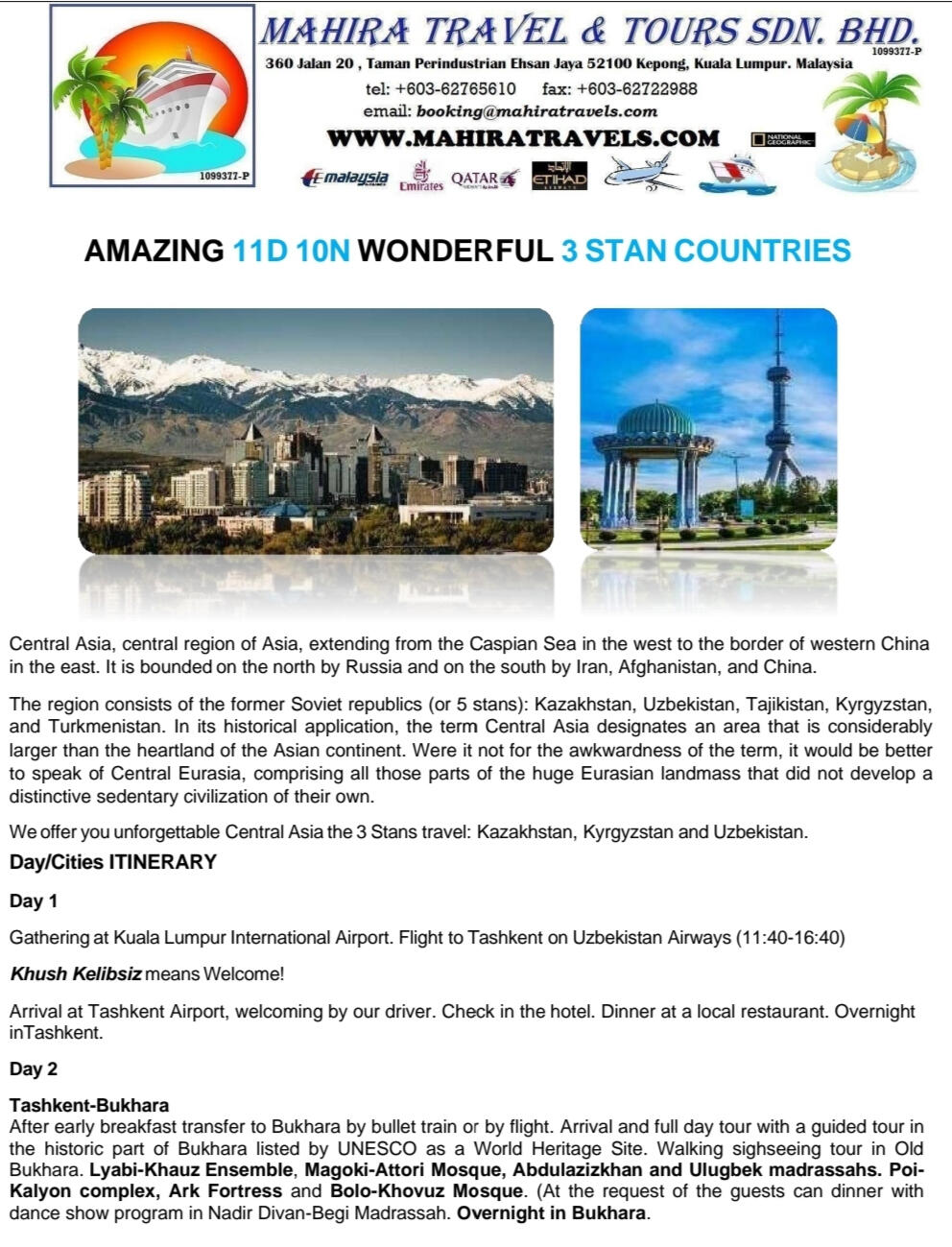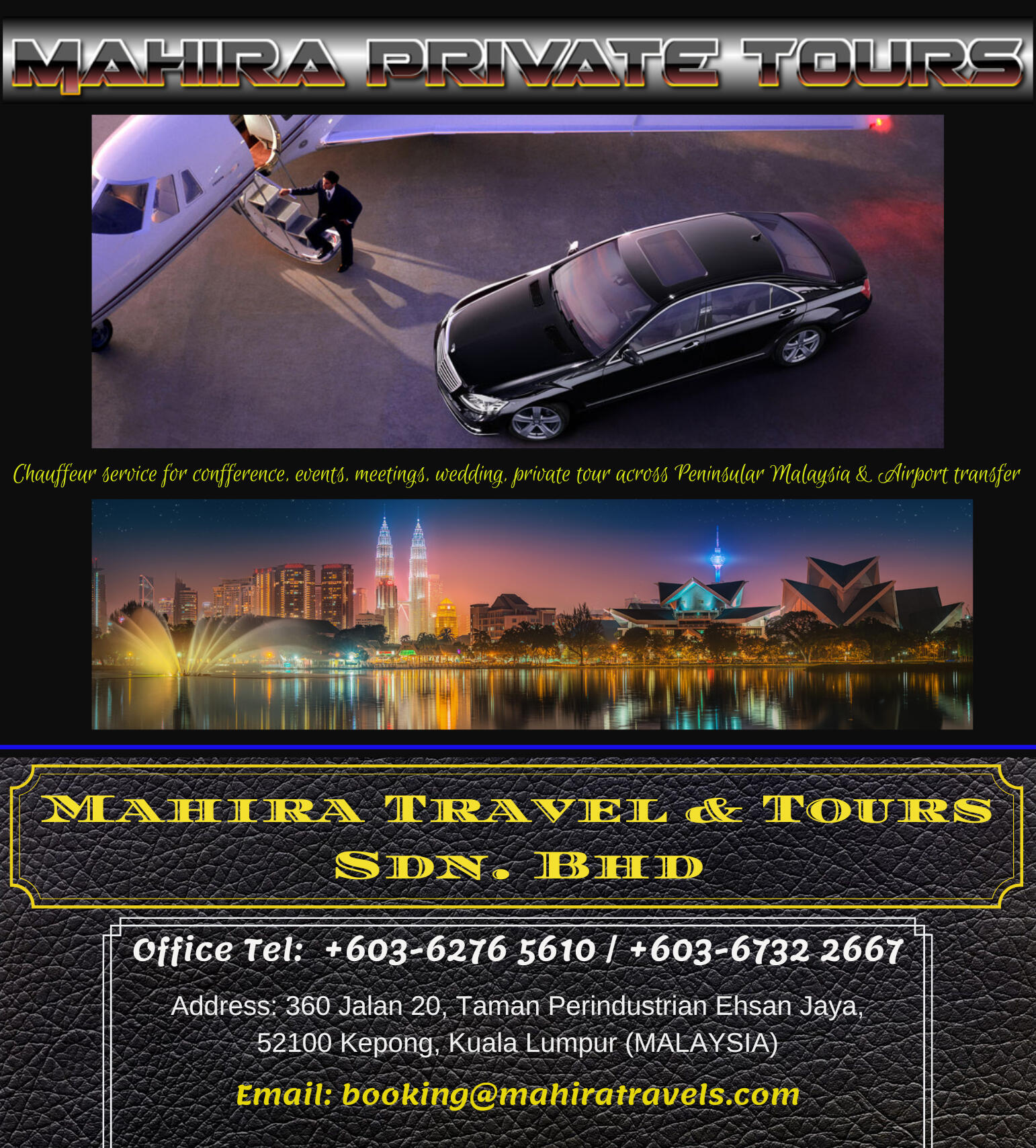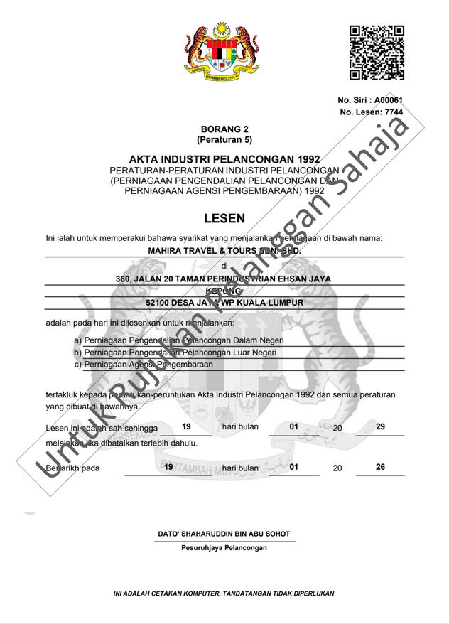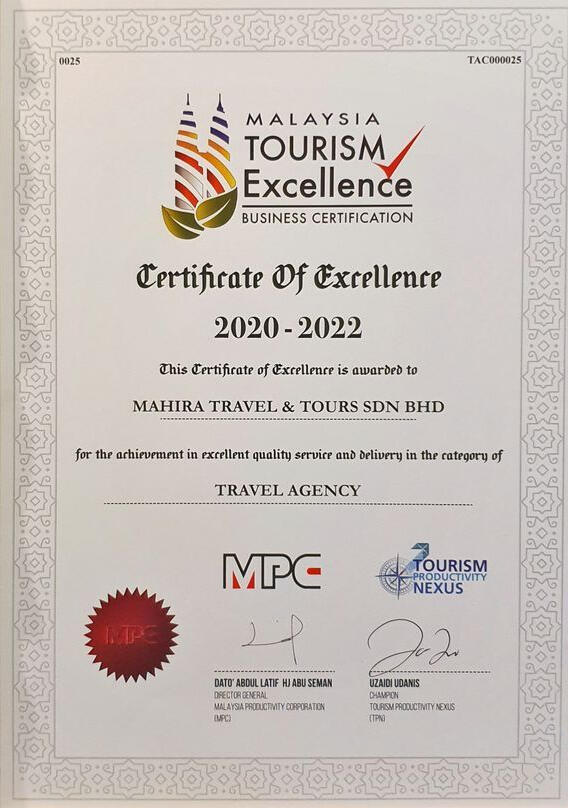 ABOUT US:We are Mahira Travel & Tours Sdn Bhd a 100% Bumiputra company fully licensed ( kpk/LN: 7744 ) conducting inbound & outbound tours as well as airline ticketing services registered with the Ministry Of Tourism Malaysia.
